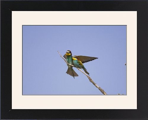 14 x11 Framed Print, Black Satin Frame Off-White Digital Mat. showing Male European beeater offering female a bee. RES-749 Male European beeater offering female a bee Rhodes May Merops apiaster George Reszeter Please note that prints are for personal display purposes only and may not be reproduced in any way. prints ardea 44 (0) 20 8672 2067. Chosen by Ardea Wildlife Pets. 14 x11 wooden frame with digital mat and RA4 print. Finished back